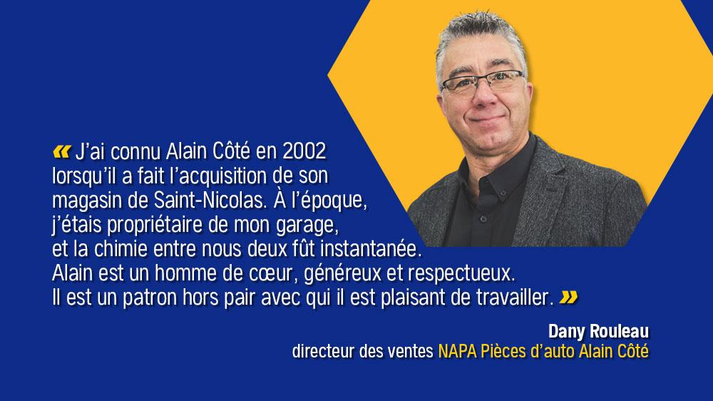 « J’ai connu Alain Côté en 2002 lorsqu’il a fait l’acquisition de son magasin de Saint-Nicolas. À l’époque, j’étais propriétaire de mon garage, et la chimie entre nous deux fût instantanée. Alain est un homme de cœur, généreux et respectueux. Il est un patron hors pair avec qui il est plaisant de travailler. » commente Dany Rouleau, directeur des ventes chez Pièces d’auto Alain Côté.